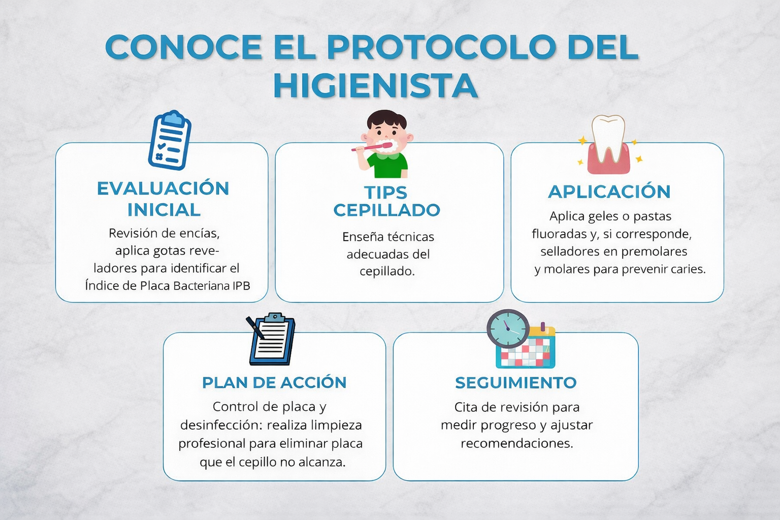La imagen muestra un protocolo básico que suele seguir un higienista dental para cuidar la salud oral y reducir la caries.